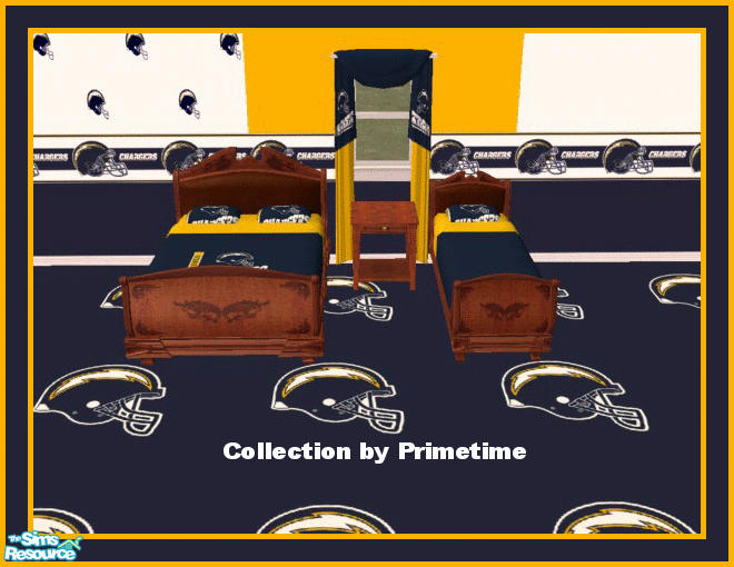 This collection is for all of you Charger Fans. It features the bedding, walls and floor to complete any fans room. No expansion pack required. It is shown with BitzyBus curtain mesh. This mesh is great as it picks up all in game bedding. You can find that mesh right here at TSR. All 32 NFL teams coming.