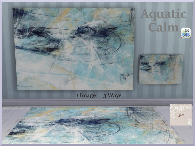A compilation of a mural, landscape painting, and a rug. The soothing calmness of the ocean is not to far away for your simmies.