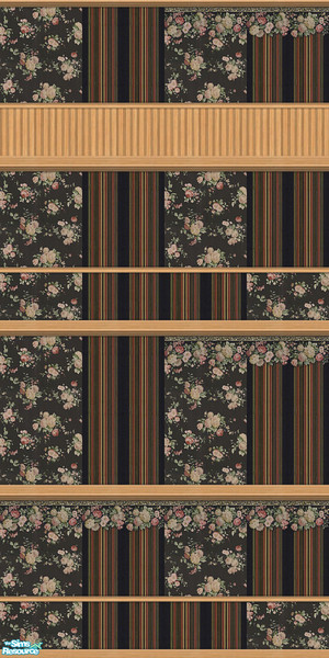 This series contains 16 walls. It consists of a floral border, a floral companion paper, and a stripe paper. The moldings are Light Wood.