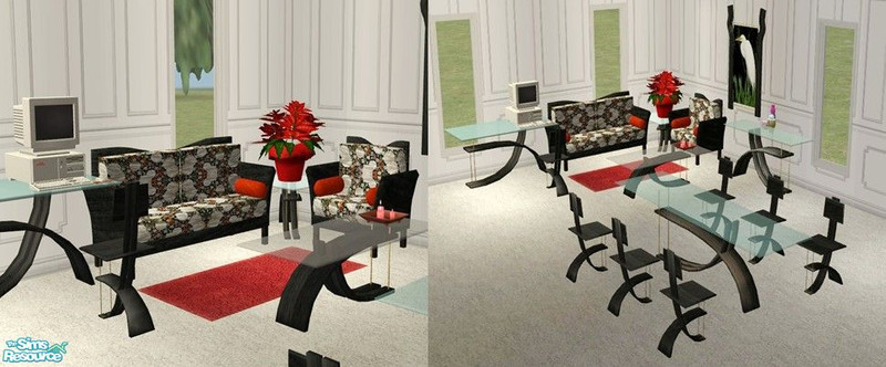 Nice black recolor of Atwa's Modern Living Room, with Detimgi's Ice Living added for flair. You need their meshes for this to show up in your game. By Riverwillows
