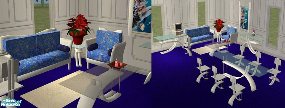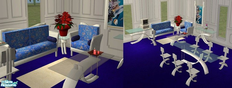 Nice white recolor of Atwa's Modern Living Room, with Detimgi's Ice Living added for flair. You need their meshes for this to show up in your game. By Riverwillows