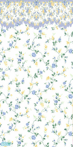 Lovely wallpaper featuring blue and yellow spring flowers, and lovely border. Part of the Spring Bath Set by Riverwillows