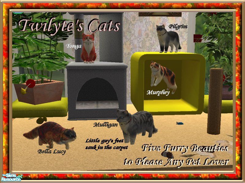 Meet Bella Lucy, Mulligan, Murphey, Pilgrim and Tonga. These furry beauties are sure to please any pet-loving Sim. Bella Lucy and Murphey are females. Mulligan, Pilgrim and Tonga are males...tho you can always change their gender when you call them up in CAS. Have fun playing with these purr-balls.
