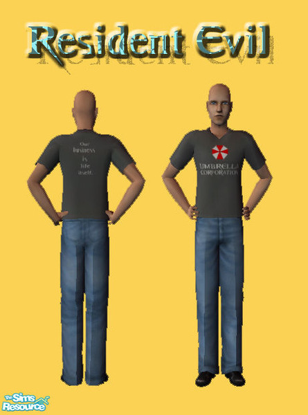 On his back you can read the text you can heard at the end of the first trailer for the movie Resident Evil Apocalypse "Our business is life itself."