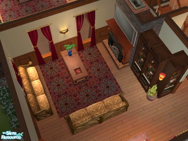 This house was designed as a family home It has four bedrooms, nursery, living room, sunken family room, 'odd'-shaped stairs, dinning room, office, kitchen and it also has a living room with a bar in the attic. This house contains costume content that I've created.