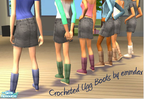 A hot set of six colors of classic tall crocheted boots by Ugg Australia for teen girls, paired with a dark wash jean skirt. These crocheted knee-high boots are a trendy look this season. Real colors from the Ugg line!
