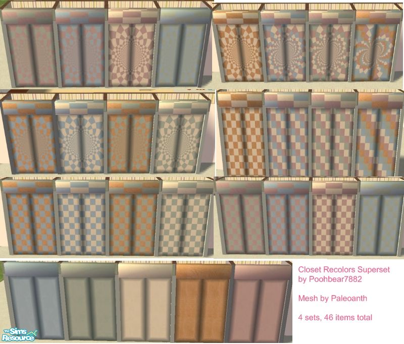 Maxis Country Set colors were used for this Superset. There are 4 sets, the solids (5 bases), the Checkers (12 bases), the psychedelic (12 bases) and the tops (17 total) making a grand total of 46 individual items. Thanks to paleoanth for the mesh (which is required) and Fizzy9 for the idea.