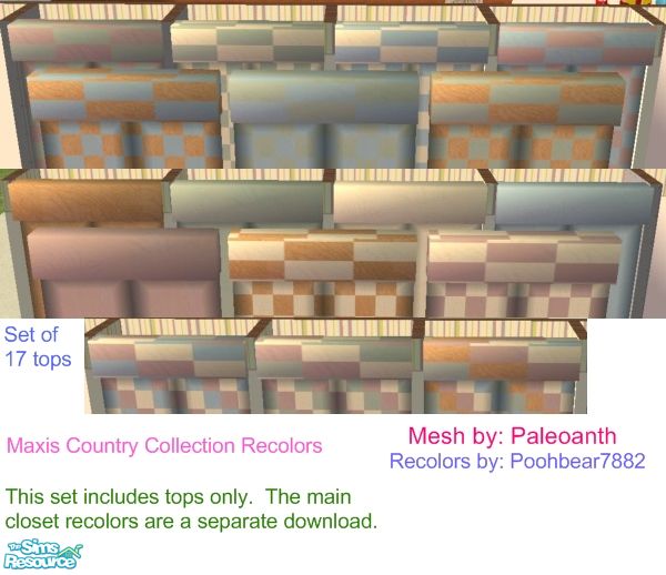 This set includes 17 recolors of Paleoanth's Closet with no handles mesh. These are the top parts only. Main parts are separate so be sure to download them as well. The colors are from the Maxis Country Collection. These can be found with the dressers. NL is required.