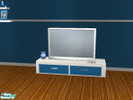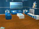 A calm and relaxing livingroom in blue and white. Includes sofa, loveseat, armchair, coffeetable, end table, tv, deco table, painting, wall and collection