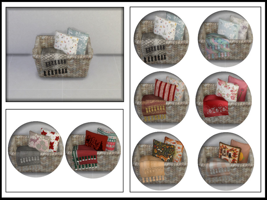 Maxis match country basket of cozies full of cushions and throws for all seasons
