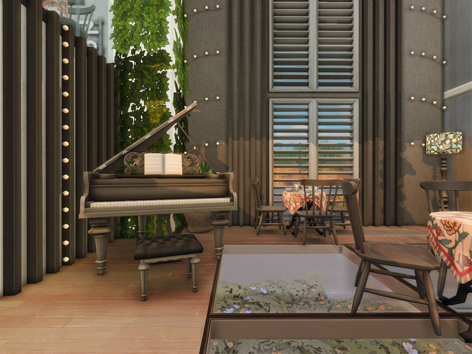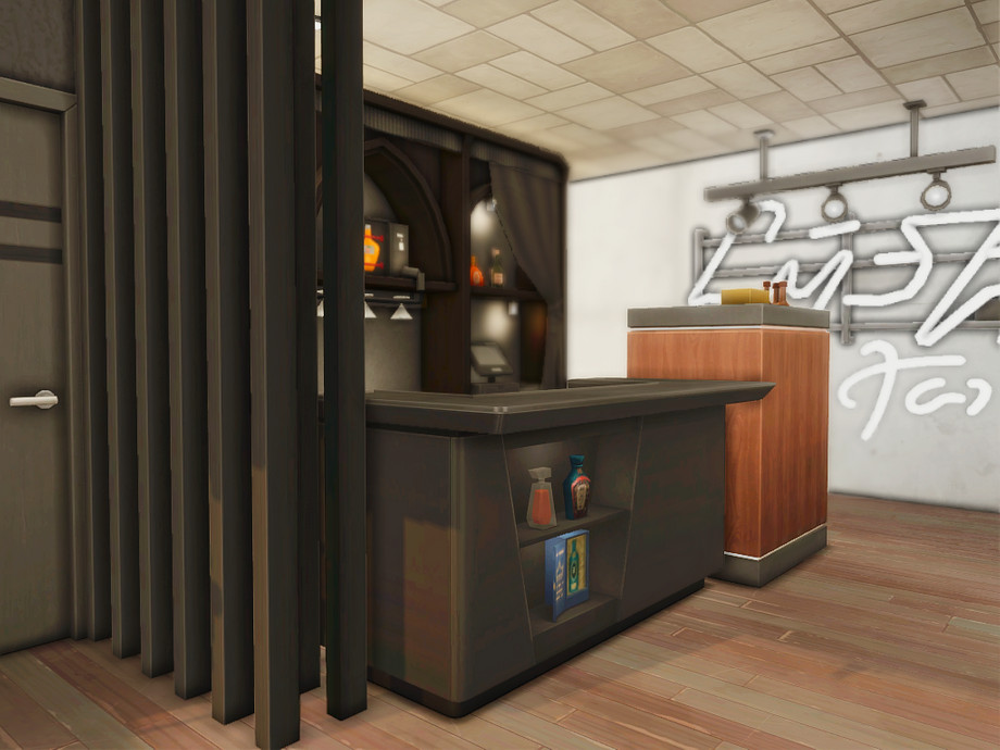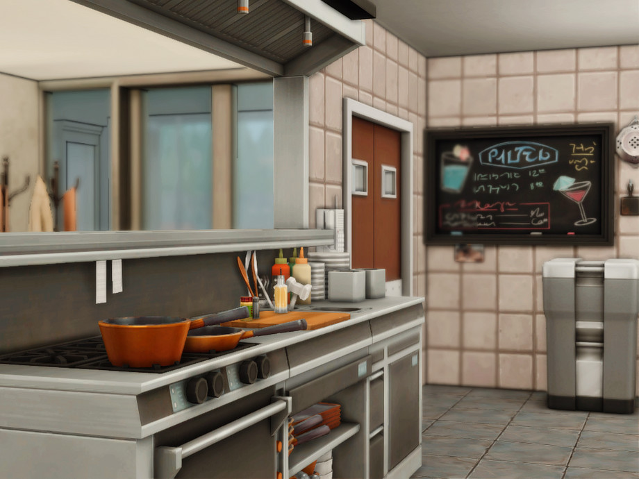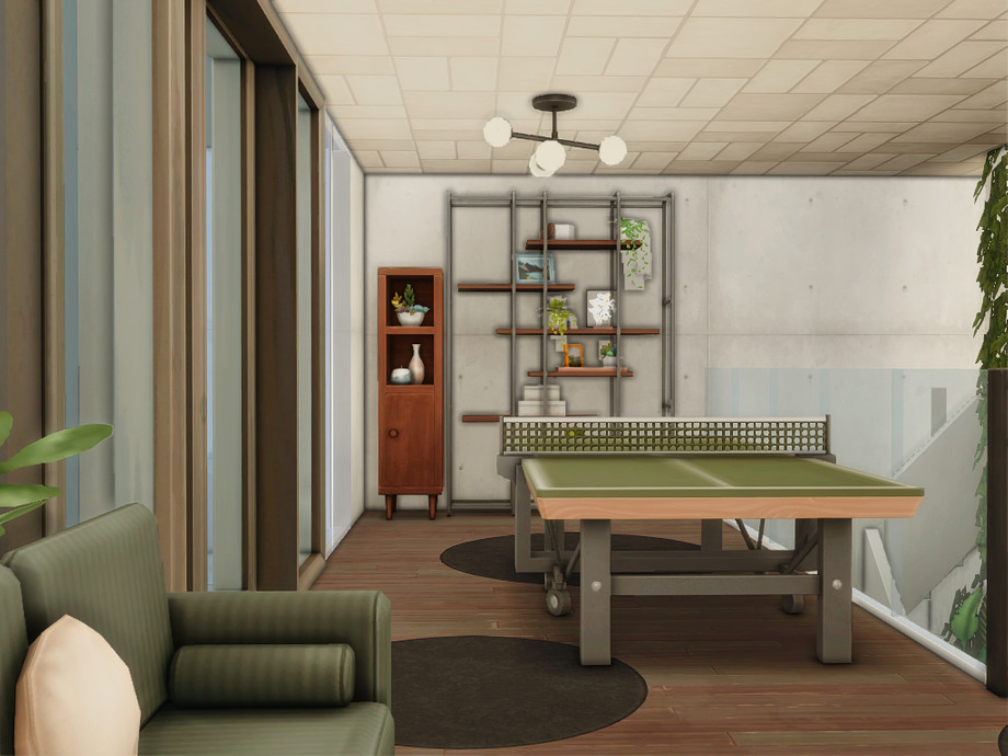 An elegant modern restaurant designed for sophisticated dining in The Sims 4. This exclusive venue combines a stylish dining area with a sleek bar and a relaxed entertainment space featuring darts and ping pong. Large glass walls, warm lighting, and contemporary architectural lines create an upscale atmosphere perfect for social evenings, romantic dinners, or lively gatherings with friends.