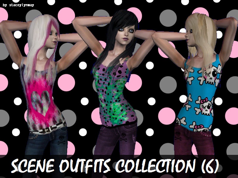 I bring to you the sixth set in teen scene clothing. This set includes 3 outfits.Pink heart, Purple/green skull and Blue with cute white and pink skulls.