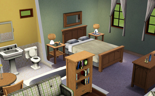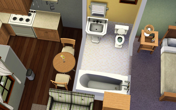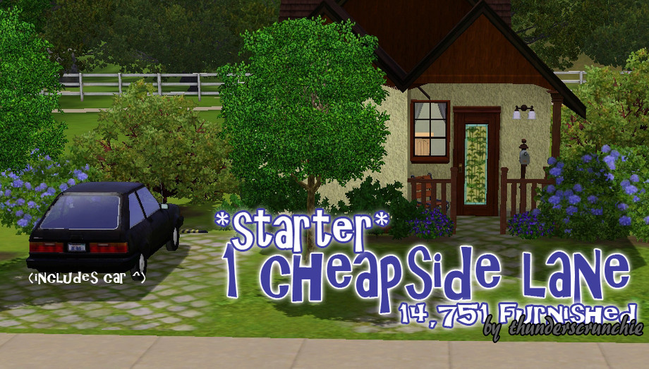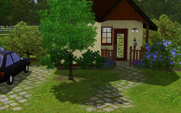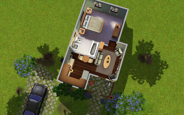 This is a one bedroom starter home perfect for a single sim or a young couple. It features a cute living room and kitchen, a bathroom and a double bedroom. Outside you'll find a partially landscaped lot with trees, carpark and a starter-car. This starter lot comes FULLY furnished and includes decorative items and curtains.