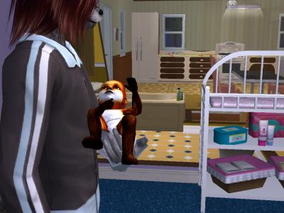 The first child of Balthazar (a raccoon) and Galleia (a fox). The babies skin was chosen randomly from that of her parents. She came out as a fox! Hopefully her sibling will be a raccoon! Don't you just love fiddling with your sims DNA?