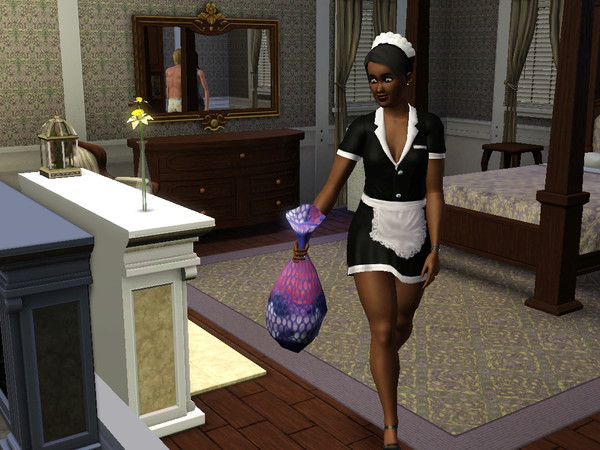 I don't know what it's in the bag, but I don't like the way that maid's looking at it. Perhaps some 'dirty laundry'. Get it? It's a pun... because dirty laundry can also mean... aww forget you. You don't get it.