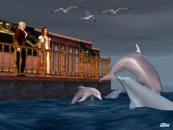 Captain Alexander Kent and a young lady stand out on the deck of his ship, watching the dolphins and birds at play...