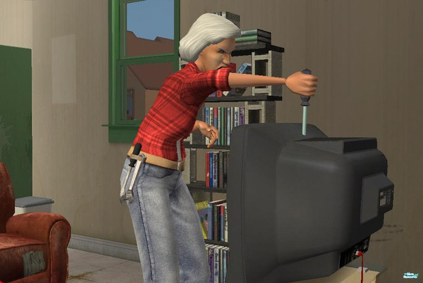 "Work! Work you bloody television! I hate this job..." ** Note that her tools in her belt are almost falling out!