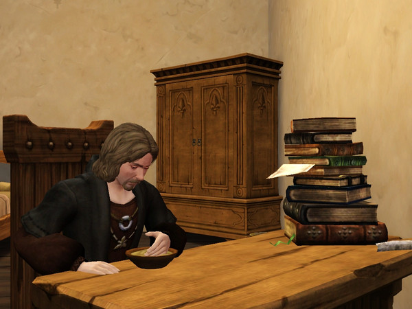 one of the lovely little details in ts medieval... the spoon isn't invented yet^^! A plate of sticky porridge and no spoon in sight is no match for these mighty prehistoricl sims ;)