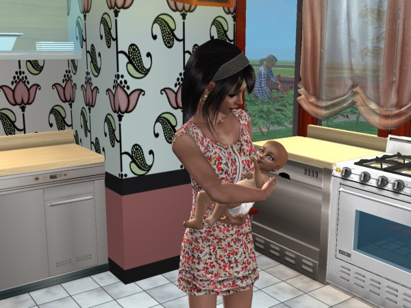 Summer and newborn baby Kayla-Rae. Also, Grandpa Noah in the backround, doing what he loves best.
