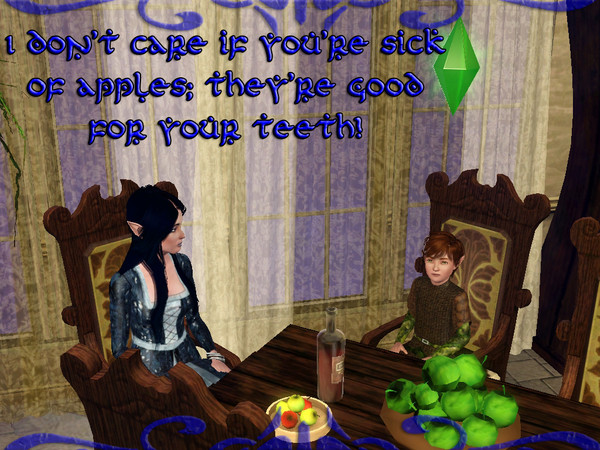 Poor Myrddin went and picked all of those delicious apples, and now the brat is saying he doesn't want any! Launcelot, what an ungrateful whelp! Vivianne ought to take away your puppets for an entire fortnight!