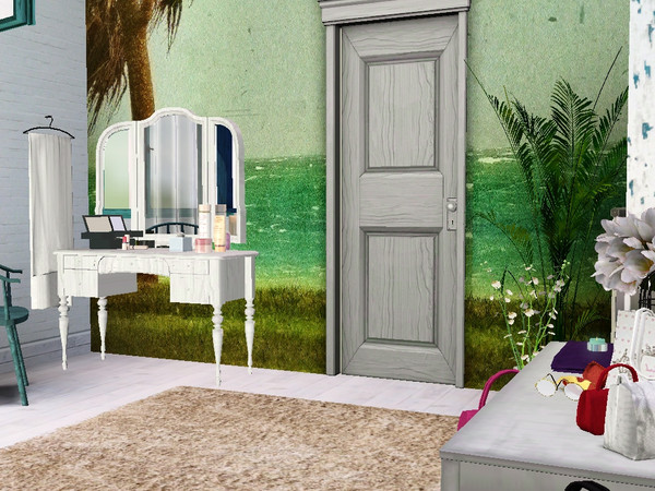 That wall looks cool! But I love the vanity! Fresh summery room!