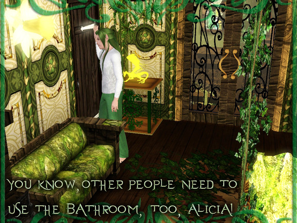 While Princess Alicia was busy playing in the mirror, Rufus was waiting to use the bathroom.... You might have to wait a bit longer, Rufus! lol Thank goodness the Hollow Tree lot comes with TWO bathrooms--better hope Roussalier isn't in the other one! :P