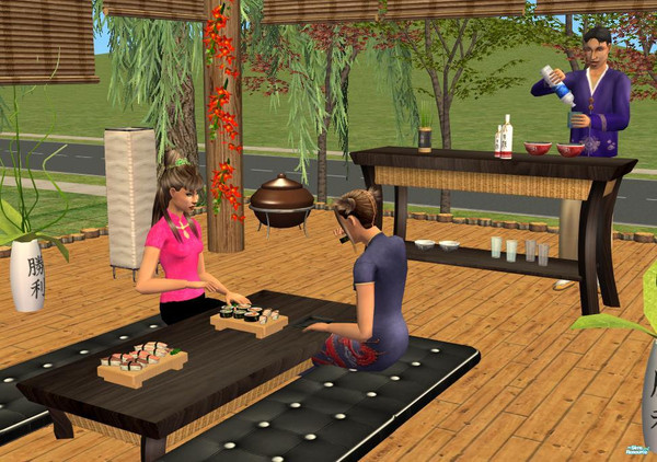 I did these furniture and I thought they look nice :) From TSR I've downloaded the edible sushi (SimsAddict99), ladie in pink dress (I forgot who made it, sorry!) and girls hairs are SunAir ;)