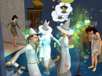 This is part of my husband's sim legacy, most of them are witches, good and evil both, ironic tho their last names are actually Evil heh. I've been going through some of his sims to grow them up and move them out by death or marriage, so i can make more room for my legacies that are growing up. Party time, witchypoo style..oh and i kind of wish i had waited to take a shot at the end of the party when they all leave on brooms..would have made a nice screen saver for my computer lol.