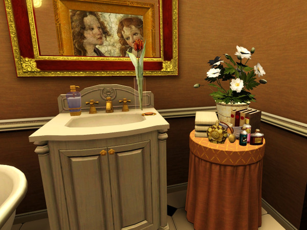 The adjoining Bathroom is tiny � well it�s an old house after all � but I had to laugh when I saw the little end table beside the sink: books and scents! That�s what she loves�