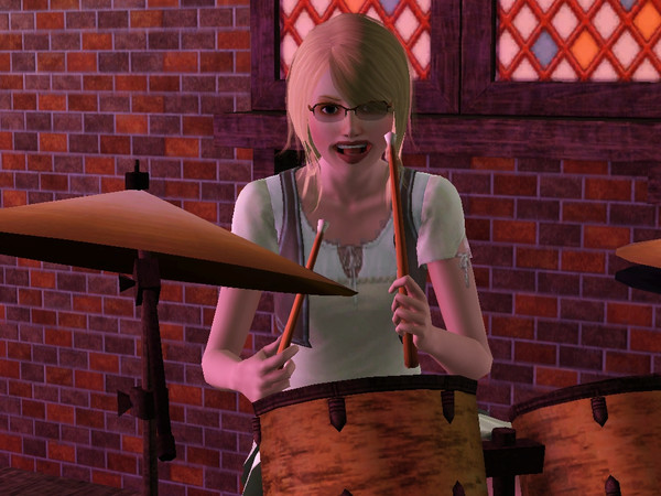 She was so happy to play the drums though she has no skill.