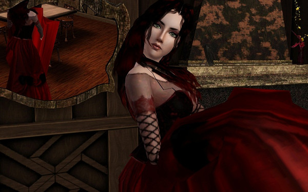 \:wub\: \:wub\: So pretty, love her dress.\:\) My sim has a gorgeous long Edwardian red dress too!!\:P Love the mirror shot \:D