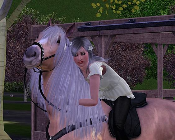 At last my self sim has pets. That is Alfafa on the pic. She is a sweet mare and I had such a great time (laughing a lot) teaching my self sim how to ride a horse...lol
