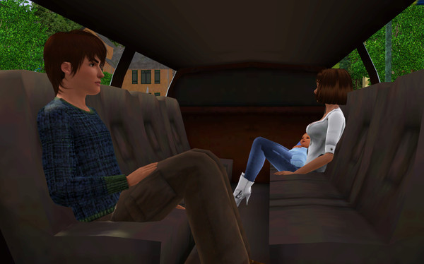 An exhausted but happy celebrity Sim couple ride home with their newborn in a limo from the hospital.