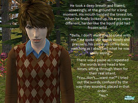 I just finished reading the Twilight series for the billionth time. So I fiddled with a Sim making him worthy of being Edward and came up with him! This part is so upsetting but its so beautiful at the same time, in a weird way. Idk, but enjoy! :]