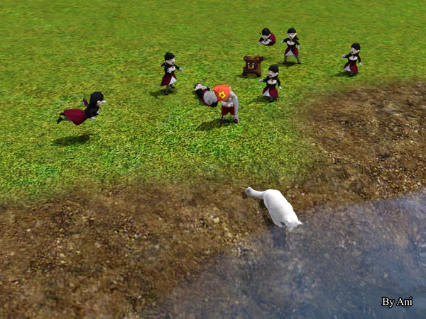 Here is a lot of dwarfs and there is also one white cat which is drinking some water from the pond.