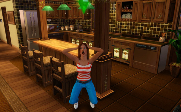 I think she likes the new kitchen. This is my Base Game TS3 version of my TS2 lot called "Sundance". There is no CC in this picture.