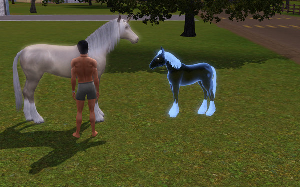 Myra Horse and her new foal, Peppermint Marquis. Peppermint's sire is the recently deceased Dagbert Marquis who, to his owners astonishment got frisky with the local (and well loved, obviously) unicorn. Peppermint loves to race as an adult, but is penalized when jumping due to her ability to literally 'float' over the jumps.