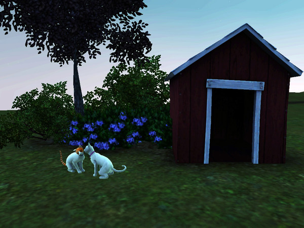 My Sims pets Whitty and Nge-Nge... Enjoying the green and their simple house.