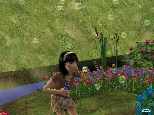 Just a sim kid having fun, blowing bubbles in the garden.