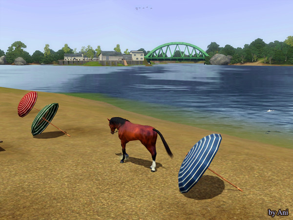 The horse is walking on the plage where are the parasols laying on the sand.