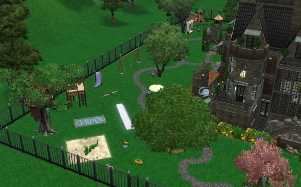 A closer view of the playground extending along the back fence with "outdoor cat essentials" at the far end. There's even a glimpse of the outbuilding leading down into the nectar-press and storage area.