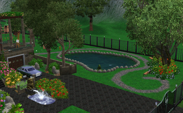 A simple pond with shaded benches and shrubbery. Not captured in the shot are a small, fenced off kitchen garden and three mature trees (those used in the original lot) sheltering the doghouse and toys. That hidden section lies between the pond (in the front) and the kitty playhouse (at the back) that are visible in the shot.