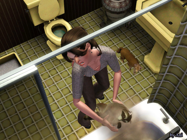This domesticated racoon has just a not very typical character... Its owner just wanted to wash his pet. At first, all the things were going good, but when the racoon was just put in the bathtub, it became angry and started to fight, so it jumped out from the sim's hands and run away from the bathroom.