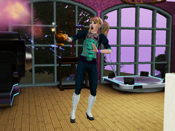 My sim, super shocked when cleaning the dusty old lamp