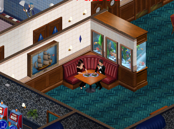 Hot Date was a huge leap forward. It was so exciting to have community lots. Here my Sim couple enjoy another steak dinner - they eat a lot of those! - this time in a swanky restaurant (with a woman cleaning the toilets in the background).
