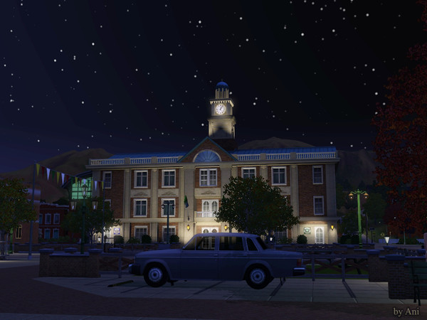 A picture from a place in front of the building of the town hall of Appaloosa Plains, beautifully illuminated, under the dark night sky full of stars.