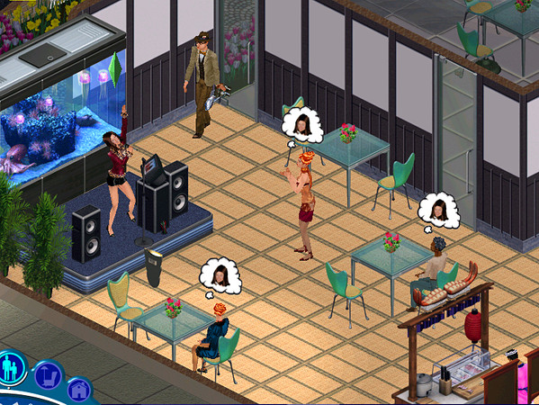 It was such a great idea to let us follow our Sims to work - especially with jobs like these! I love Studio Town. Here my Sim performs at a karaoke sushi bar - it's not exactly packed, but at least the paparazzi are interested!
