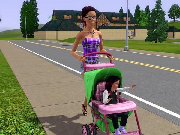 My sim on a stroll with her baby