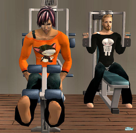 Two sims from my game 'working out'. One of the sims i made( the dark haired guy), and one the other one, is a friends self sim(it's 'simenroute').