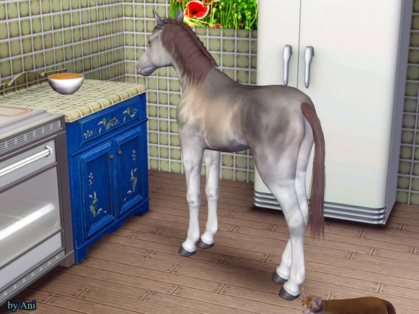 But what this foal do in this kitchen? An abstent-minded sim from this house was going away and then forgot to close the house's entering door, so the foal get into the house and was immediately attracted by the big bowl of pasta with cheese, left on a counter by the same sim. There was also the red cat, (living here) that used a lot of times to stole some forgotten food from the table, thinking about the few of possibilities to get that food for this new time. LOL))).